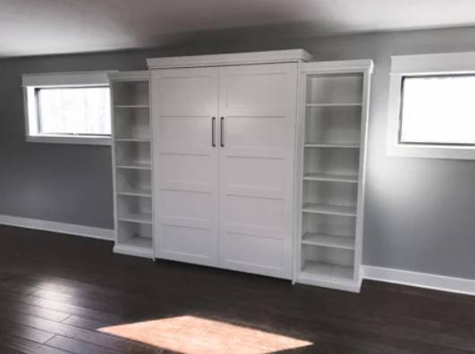 To account for the total width of a project when purchasing side cabinets for your Murphy bed, simply add the widths of each side cabinet and the crown molding of the Murphy bed together. The side cabinets will easily install next to the Murphy bed frame on either side — even between two Murphy beds or other cabinets. Cabinet doors swing away from the Murphy bed. Side cabinets can also be ordered after receiving your Murphy bed if you decide that having them would benefit the space.