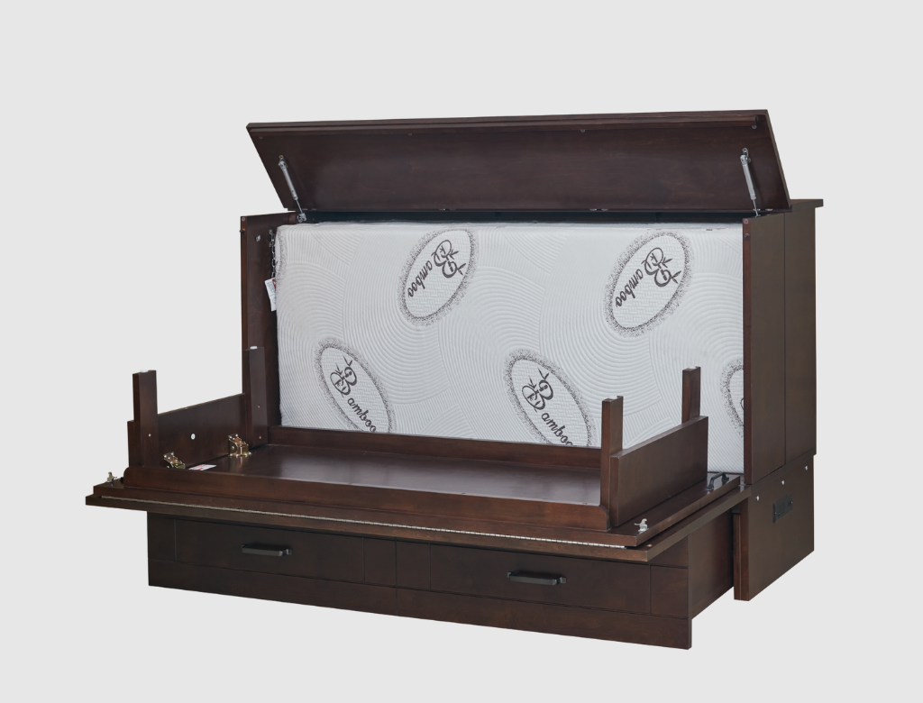The Aztec is a free-standing CabinetBed that transforms into a bed under 30 seconds no wall mounting or permanent installation required. Its stylized grooved panels clean lines, and side opening panels give it a modern door look while keeping operation effortless for daily use.